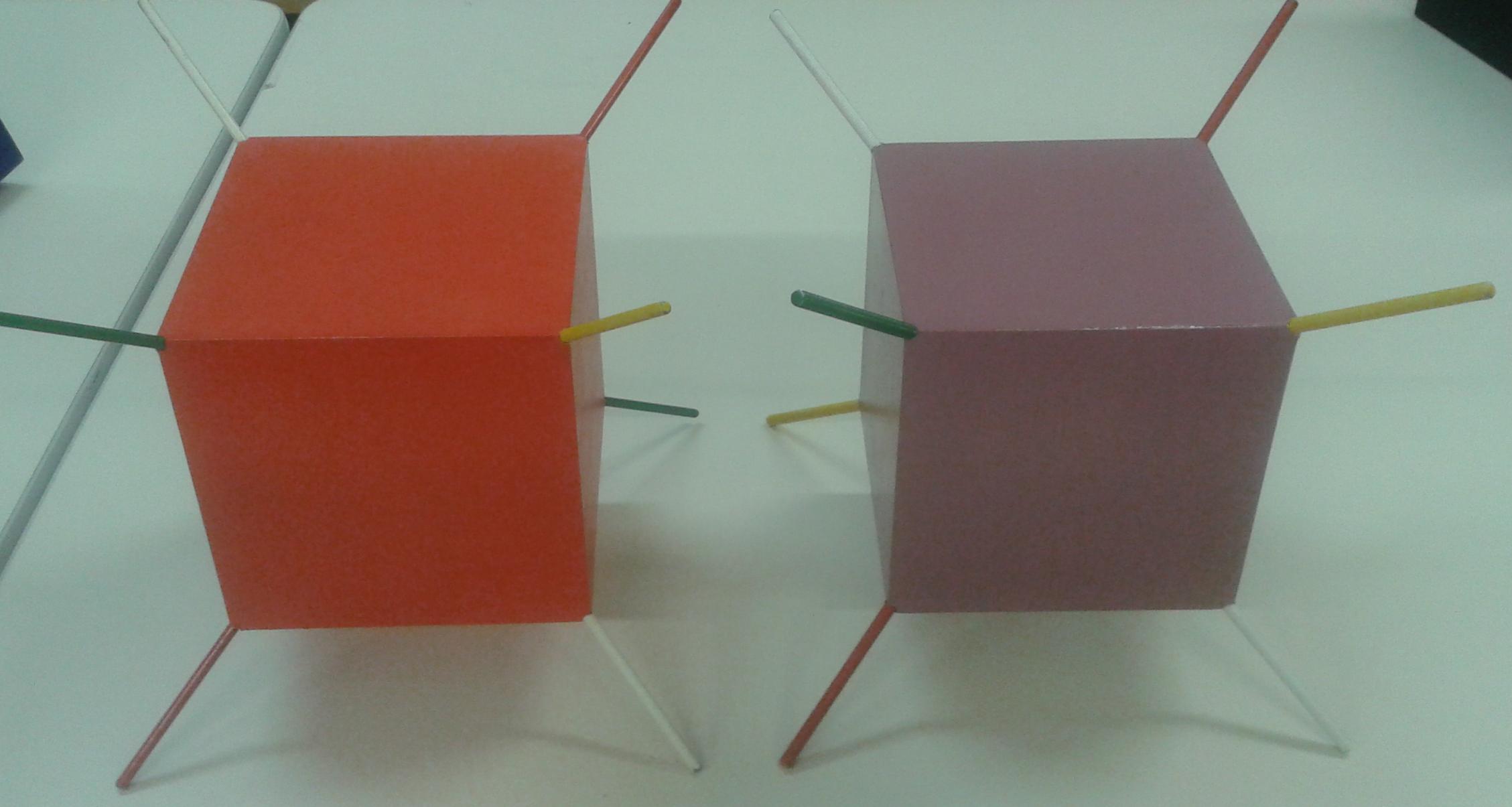 De quantas maneiras distintas podemos movimentar um cubo de forma que ele sempre ocupe o mesmo lugar no espaço? Usando os cubos com as diagonais marcadas, é possível verificar que cada movimento desse tipo corresponde a uma troca na posição das diagonais. Esse é o primeiro passo para perceber que cada simetria do cubo corresponde a uma permutação distinta entre as 4 diagonais e vice-versa. Ou seja, no grupo das simetrias do cubo temos 24 (ou 4!) elementos.